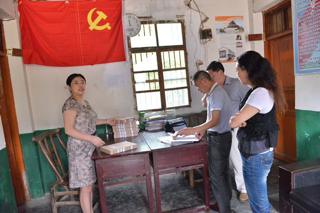 扶贫点八里坪村村干部(右一)在清点扶贫资金10000元