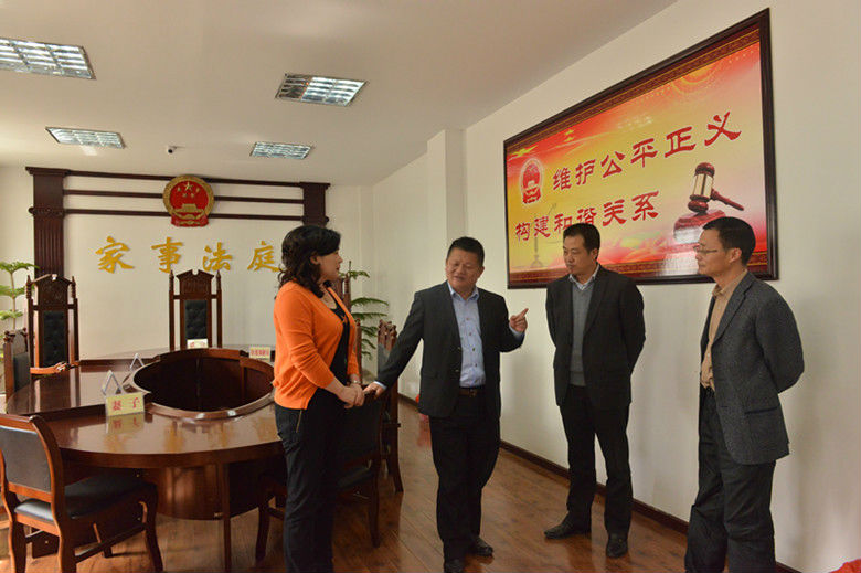 王健院长一行随后来到城关人民法庭,查看了服务大厅、正在庭审中的审判庭及家事法庭、心理咨询室、温馨调解室等相关情况。王健院长对城关法庭走家事审判专业化法庭道路取得的成绩给予了充分肯定,认为是一个很好的方向,是专业化审判的一个典范,他强调一定要认真总结,进一步发扬。